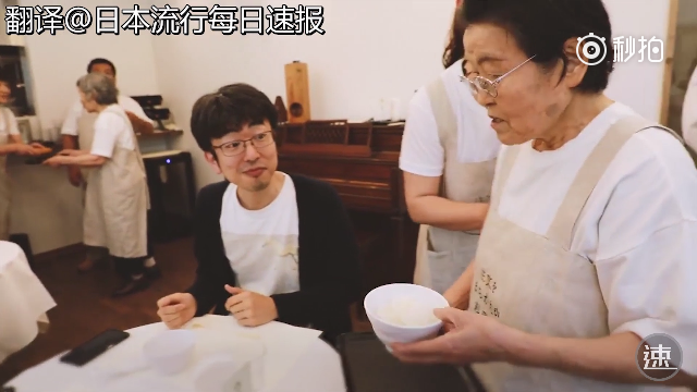 一位奶奶服务员小心翼翼捧过一份蛋包饭,在大家的注视中犹豫了一下,走向窗边的一桌。