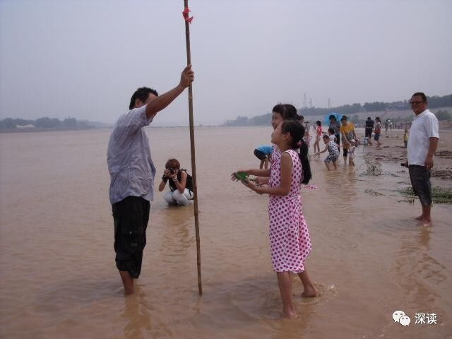 2012年5月1日,黄河边上来了一群初中学生,其中有个小伙子怎么劝都不听,认为就在边上玩儿没事。我从河岸拽了棵枯死的小白杨,从岸边走进黄河,这时水只到我的膝盖,然而仅仅再走一步,直接见不到人,只剩下杨树枝子还有一点露出水面。