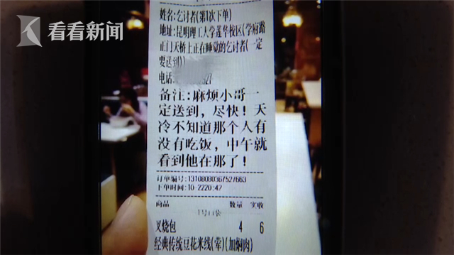 小谢说,这是他到店里上班两年来,第一次接到这样的外卖订单,订餐人姓名显示的是"乞讨者",送餐地址写着"昆明理工大学莲华校区学府路正门天桥上正在睡觉的乞讨者",备注上写着"麻烦小哥一定送到,尽快!天冷不知道那个人有没有吃饭,中午就看到他在那儿了。"原来,这是某位不知名的订餐人点给素不相识的街头流浪者的。值班经理也被这份订单深深感动了,希望能将这份温暖传递下去,于是,他在订单基础上又让小谢加了一份豆面汤圆。