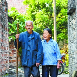 昨日早上九时,记者来到九江镇河清四村时,潘德时和何爱在孙子的陪同下,早早便守候在村口。留着黑发小长辫子、身材娇小的何爱微笑着和记者聊起了天,而潘德时虽然耳朵不灵,但是思维依旧清晰,他对着记者大声说:“我耳朵不好啊,听不清楚了,千万不要介意啊!”随后,两名老人领着记者来到了他们的家。