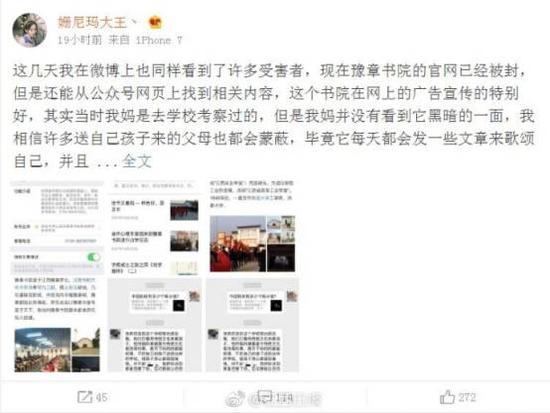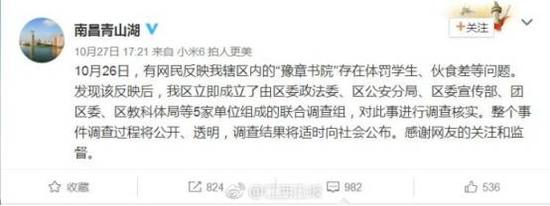 10月30号晚间,南昌市青山湖区官方微博发布情况说明称,经调查,网帖反映的问题部分存在,书院确实有罚站、打戒尺、打竹戒鞭等行为和相关制度。对此,已责成教育部门对豫章书院进行处罚,对相关责任人进行追责。下一步,将加大对该区民办教育机构监管力度。