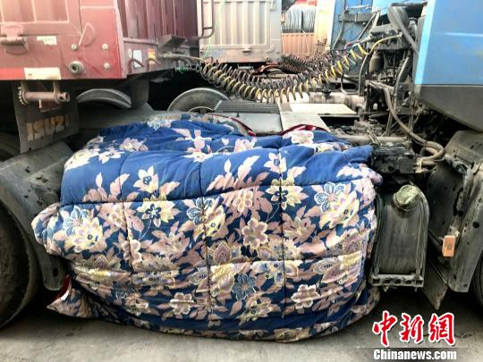 图为卡车司机用棉被为卡车“取暖”。 钟欣 摄