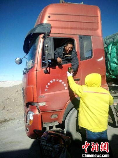 图为现场救援人员为滞留卡车司机送食品。 钟欣 摄