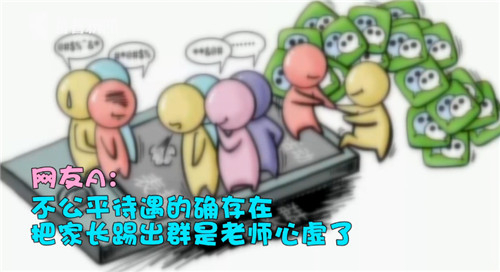 现在的人们,习惯根据场合、事情的不同,划分成很多圈子,而各种各样的微信群,也就应运而生了。学生家长群,就是这类圈子微信群中的一个。不过,有人发现,家长群里的故事,可不简单;很多时候老师随便发条信息,群里的家长们都会一窝蜂地"点赞"称颂。而最近,又有家长反映说:因为自己在家长群里质疑老师收礼,不公正地将身材矮小的儿子常年安排在教室最后一排,结果,班主任把自己踢出了家长群。