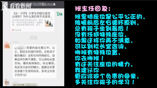 爱子心切,于是,这位家长写了篇关于孩子遭受不公平待遇的文章,并取标题为"小学生的座位是怎么排的?为什么我的孩子总是坐不好的位置"。随后,这位家长将文章转发到了家长微信群里,很快,班主任便作出了这样的回复:班里排座位是公平公正的,依据前后左右循环原则,总有孩子坐到最后!没有任何特殊座位,如果这样你再不满意,可以到校长室咨询,哪班有特殊位置,你去哪班! 有这关注座位的精力,我建议你更应该做个负责的母亲, 多关注你孩子的学习!