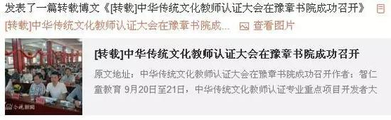 比如,2015年,该机构开了个培训会议,自封为“中华传统文化教师”的认证者: