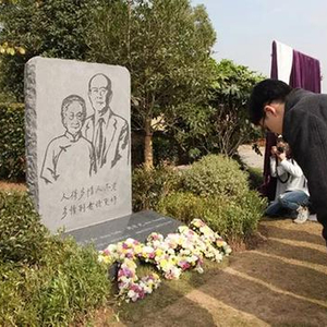 周有光夫妇的墓前雕像,依据二人合照以线刻工艺呈现于花岗岩石碑之上。石碑高1.73米,宽1.07米,厚18厘米。夫妇像下的“人得多情人不老 多情到老情更好”描摹自夫妇二人的亲笔手书,前半句由周有光书写,后半句由张允和书写,那年周老93岁、张老89岁。