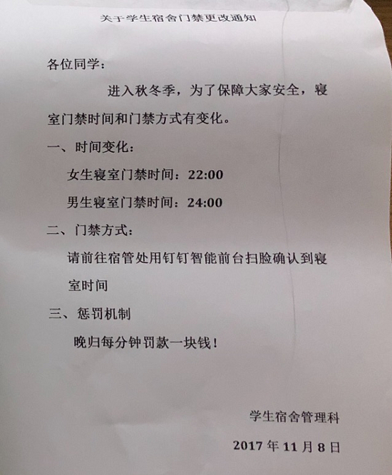 据了解,该学校宿管处为了提高宿管工作人员的工作效率,宿管阿姨不再像以前那样一个个楼层去敲门,只要学生回寝室去宿管处扫脸确认到寝室时间就可以。其实此行为是校方帮助行政和后勤提升工作效率所做的努力。爆料还说女生必须晚上10点,男生可以晚回两小时,实际情况是该校考虑到晚归对女同学的安全有威胁,因此希望女同学可以尽早回到寝室就寝,避免发生不必要的安全问题,但男生也是有时间规定的,所有人迟到晚回都要惩罚。据了解,该校在执行期间,宿舍的秩序提升了许多,宿管阿姨和校方都很满意。