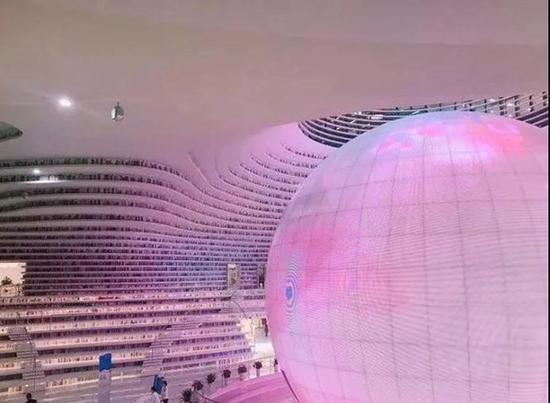 其实,这个多功能厅外部是由一个穹幕影院“包裹”而成的大球,大球的外部可以播放电影,内部则是图书馆的报告厅,可以容纳100人。