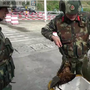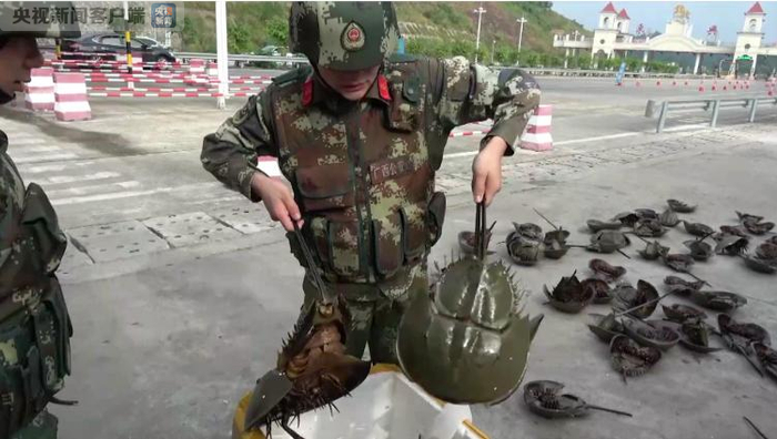11月16日晚,楠木山边境检查站官兵在执勤岗对过往车辆进行例行检查时,发现一辆货车提供的货单与该车所运输的货物不符,而且司机神色慌张,说不清货物的种类。官兵立即对该货车进行检查,发现国家二级保护动物东方鲎。