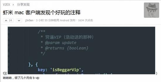 而在虾米音乐MAC客户端的代码注释里,一位发帖人看到了这行代码……