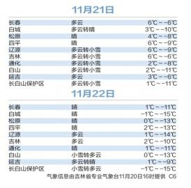 今天白天,全省晴转多云。今天夜间到后天白天,全省多云,辽源、吉林、通化、白山、延边西部、长白山保护区有小雪。22日夜间到23日白天,全省多云,吉林东部、白山北部、延边北部、长白山保护区部分地方有小雪。
