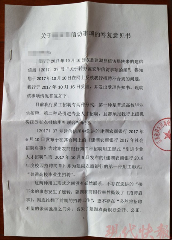 11月10日,张斌驰便收到了建湖农商银行针对该信访事项的答复意见书。建湖农商银行表示,6月10日发布于在其官网上的《建湖农商银行2017年社会招聘启事》为建湖农商银行第二种招聘用工形式 “ 引进专业人才招聘 ”。而2017年10月发布的《建湖农商银行2018年度校园招聘简章》系为建湖农商银行的第一种用工形式 :“ 普通高校毕业生招聘 ”。