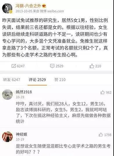 除了对于推免制度的质疑和对于女性能否坚持科研的担忧,冯钢并没有什么刻薄的语言和歧视性的表达。他真正所不悦的,不是女性占据了推荐名额,而是假如女性不能够在科研的道路上走下去反而浪费了这种资源。如果换位思考,作为导师,当然希望自己的学生能在学术道路上走得更远。
