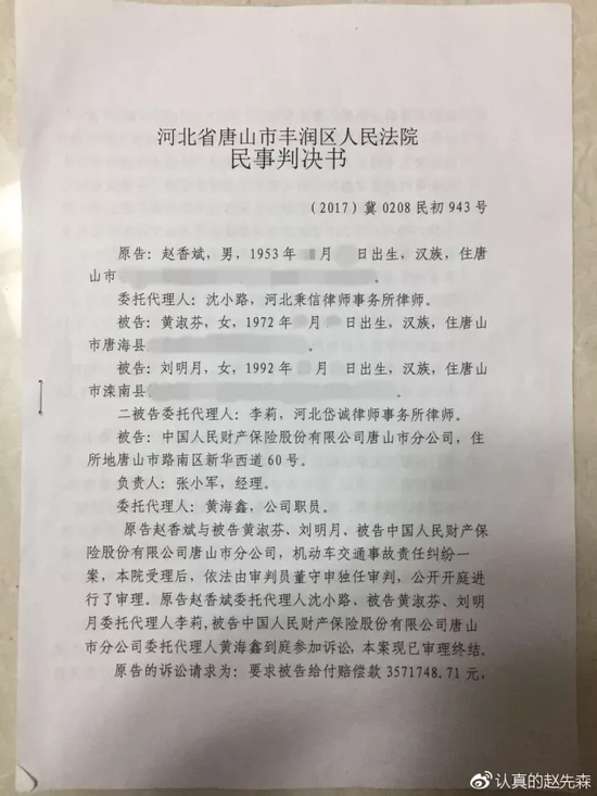 在发布消息之后,赵先生又在微博陆续公开了交警责任判定书、法院判决书以及其他基础证据。