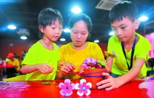 | 儿童和家长合作进行手工制作有利促进亲子感情。广州日报全媒体记者廖雪明 摄 |