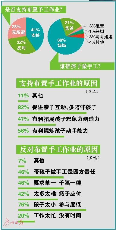 日前,广州日报就家长是否赞成幼儿园学校布置手工作业展开调查,其中受访的四成家长表示赞成,三成家长不赞成,另外三成家选择了“无所谓”。至于“为何支持亲子手工作业”这道多选题,超过八成家长认为促进亲子互动,能多一些时间陪伴孩子。