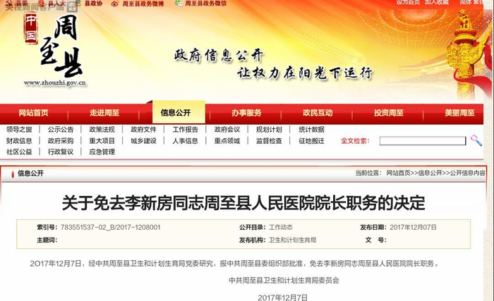 央视网消息:今天(12月7日),陕西周至县政府网站刊发中共周至县卫生和计划生育局委员会的消息称,经中共周至县卫生和计划生育局党委研究,报中共周至县委组织部批准,免去李新房同志周至县人民医院院长职务。