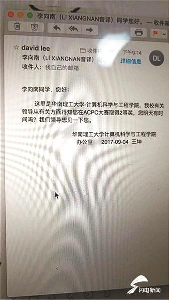 昨天(8日),华南理工大学宣传部也对“李向楠收到过华南理工大学邀请函”的说法进行了回应,宣传部的卢老师称,邀请邮件并不是该校老师发的,邮件中落款的计算机信息与工程学院王坤老师,查无此人。