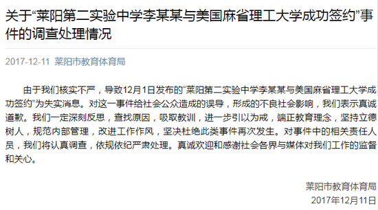 12月11日,“莱阳市教育体育局”微信公号发布了《莱阳教体局通报14岁神童签约麻省理工调查结果:核实不严》。通报中称“由于我们核实不严,导致12月1日发布的‘莱阳第二实验中学李某某与美国麻省理工大学成功签约’为失实消息。”