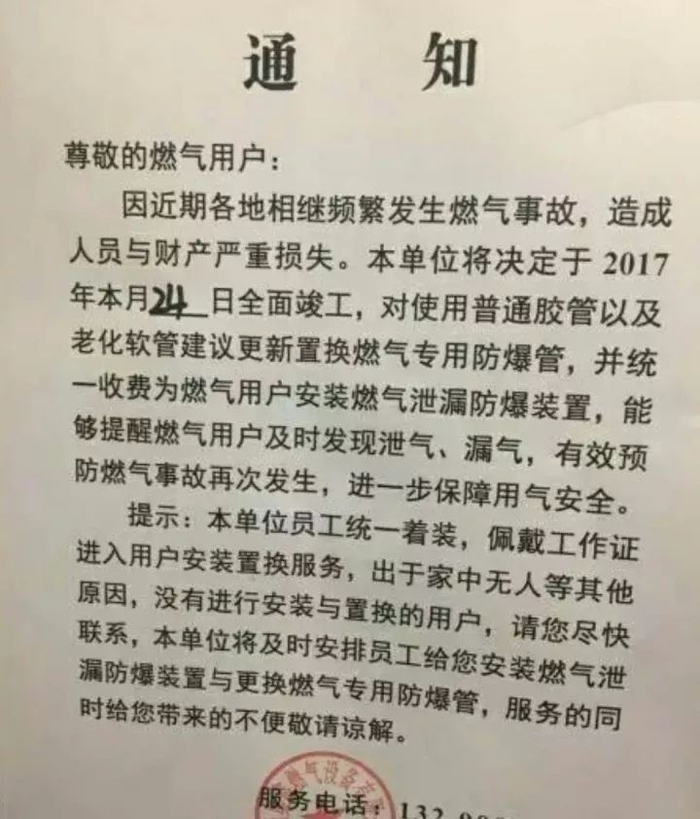 第二种:明码标价。以燃气公司名义,要求用户统一更换软管、报警器等设备。