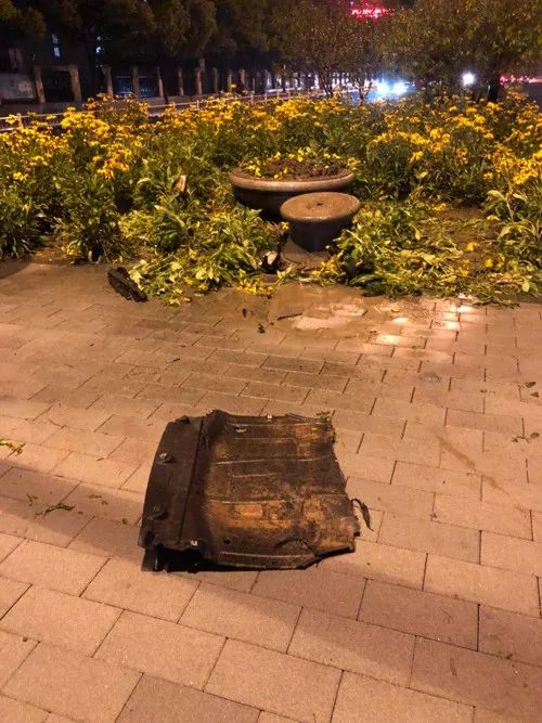 在丰潭路北向南莲花街的路口,路中央的绿化带旁,留着一堆电动车的零部件和一把深色的格子雨伞,一块汽车的底盘护板脱落在地。