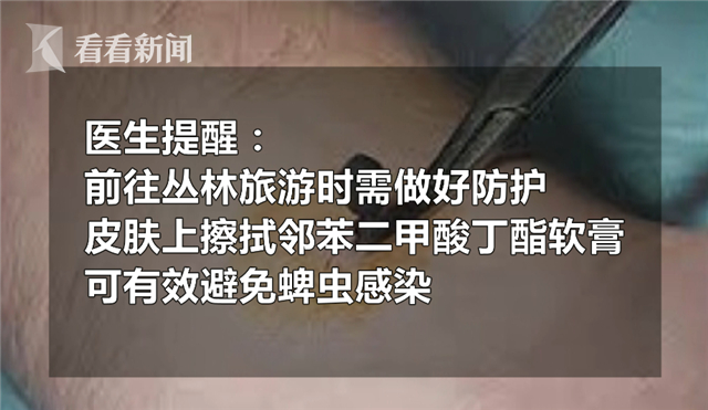 医生先用石蜡油涂在蜱虫周围,让它不能呼吸,这样一来,它就松口了,接下来医生再用小钳子把它夹出来。这种蜱虫多出现于热带、副热带的丛林地区。医生提醒各位旅游爱好者,如果去热带、副热带的丛林里旅游,必须要做好防护措施,在皮肤上擦邻苯二甲酸丁酯软膏可以有效防治蜱虫。