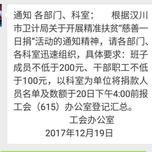 通知内容显示,此次捐款是根据汉川市卫计局关于开展精准扶贫“慈善一日捐”活动的通知精神。医院作出了“捐款金额”、“上报捐款人员金额名单的截止时间”。捐款金额为:班子成员不低于200元,干部职工不低于100元。上报工会的截止时间为“20日下午4:00”。