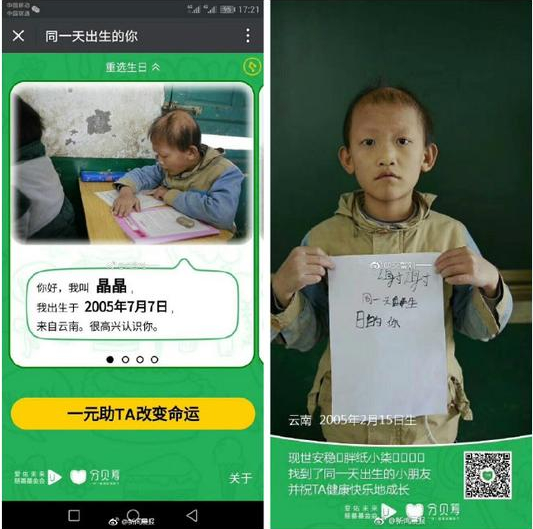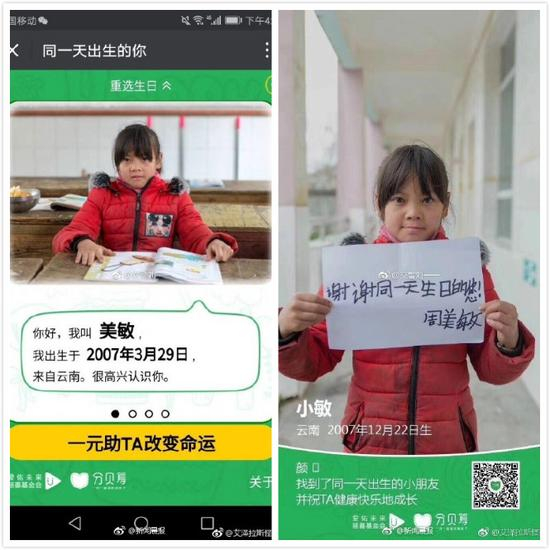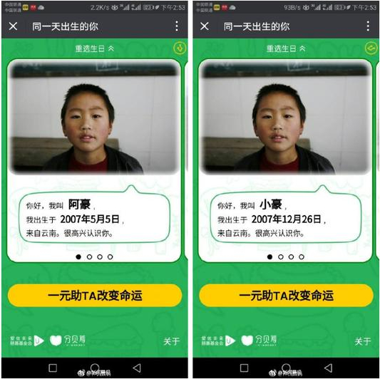 [“分贝筹”,为何要帮助的孩子照片相同,生日却不一样?]今天(12月23日),爱心活动“分贝筹”在网上刷屏,宣称“一元助TA改变命运”,可寻找和自己生日相同的贫困儿童,为其捐赠一元钱。然而,细心的网友发现,有女孩头像相同,但她们的生日却不是同一天,接下来又有人发现了类似情况。甚至还出现了有孩子出生在2009年2月29日……不少网友在发现问题后,认为该活动的可信度值得怀疑。
