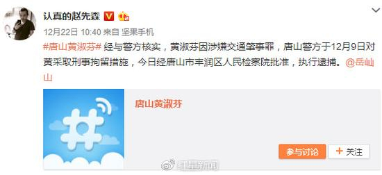 22日上午10点40,受害者儿子赵勇在其个人微博@认真的赵先森 上发布微博称,“经与警方核实,黄淑芬因涉嫌交通肇事罪,唐山警方于 12 月 9 日对黄采取刑事拘留措施,今日经唐山市丰润区人民检察院批准,执行逮捕。”