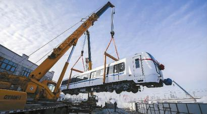 1小时30分钟后,由6节车厢组成的地铁列车全部组装完成,由牵引机车带入库内。