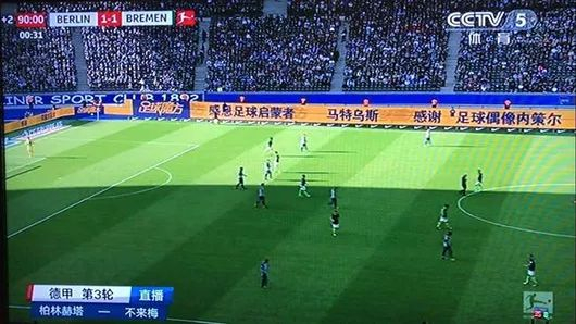 今年9月,德甲第3轮柏林赫塔主场1比1战平云达不莱梅的比赛中,场边广告牌出现了“感恩足球启蒙者”的中文字样,感谢的对象既有马特乌斯、卡恩等国际足坛巨星,也有前国足主帅米卢、著名解说于大川等中国球迷耳熟能详的名字。