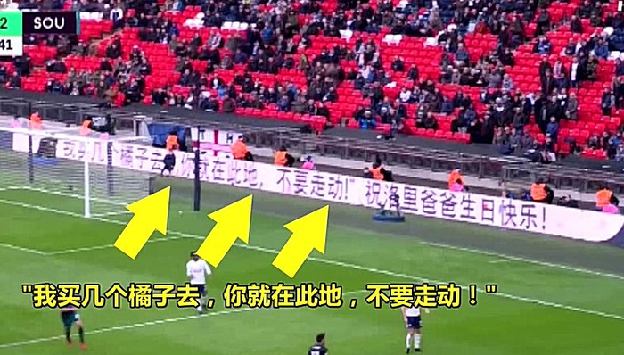 北京时间12月26日晚,2017-2018赛季英超联赛第20轮展开角逐,热刺主场5-2大胜南安普顿。比赛刚开场,场边广告牌上就出现了一排中文:“我买几个橘子去,你就在此地不要走动!祝洛里爸爸生日快乐!”