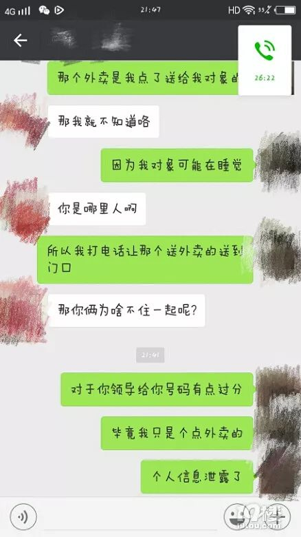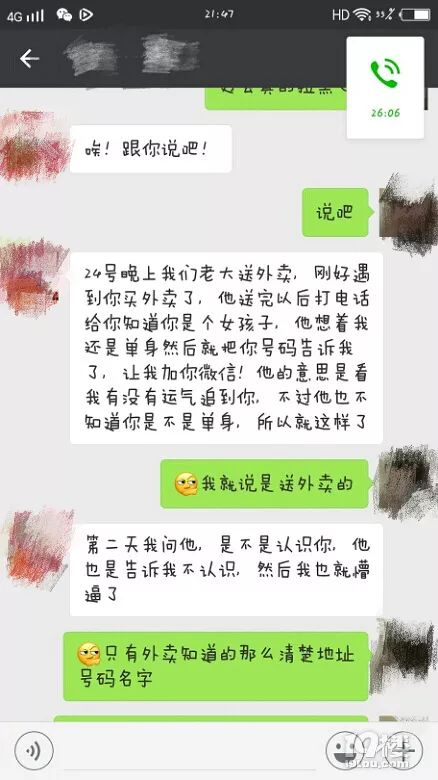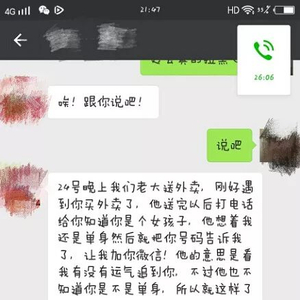 他说是我闺蜜给的,说好了不能说…我一直反复问他是谁谁给的,最后没办法了他说是24号我点了一个外卖, 送外卖的是他老大,然后他老大见她是单身,打过电话知道我是个女孩,就把我的联系方式给他了!!