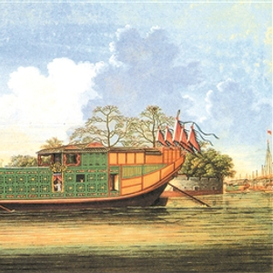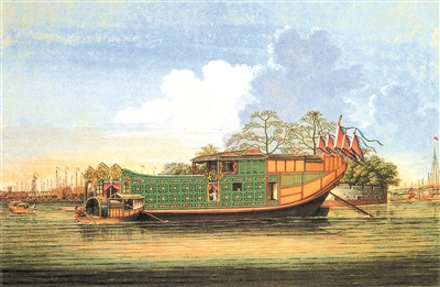 | 19世纪50年代,珠江上的楼船。这是一幅水墨画,由清代定官画室绘。 |