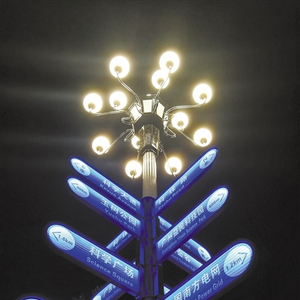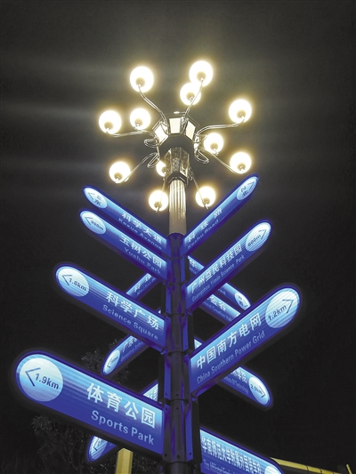 在广州国际体育演艺中心旁,有一个巨大路牌引人注目,十多个周边地标都有独立的指引牌,以精准的角度指明方向。夜幕降临时,这个路牌就像一棵发光的大树,所有指引牌都发出蓝光,照亮前行的路。
