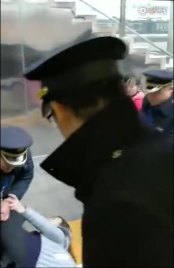 两名执法人员最后采取强硬措施,把她拖到车门外,但她倒地后用脚卡住车门。