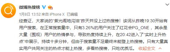 然而,事件在8日下午开始反转。针对买热搜行为,微博官方公开回应,称“‘紫光阁地沟油’昨天并没上过热搜榜!”微博表示,该词从7日19:30开始有用户搜索,在正常搜索量中,只有3.26%的用户关注了“红花会PG_ONE”,其余是大量(围观)用户的热情参与,导致热度持续上升,在20:42进入了“实时上升热点”中展示,持续十多分钟,但由于搜索量不足最终未能登上热搜榜。也就是说,网友截图的“热搜榜”并非排名前列的“热搜榜”,而是“实时上升热点”,因为围观群众的参与导致热度上升,后来没上去真正的热搜榜。