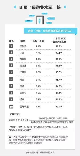 去年3月15日,艾漫数据公布了一组明星“水军榜”,显示明星的热度数据有9成注水。从“水军”占比、“最敬业 水军 ”、单个“水军”“注水量”揭示当今网络红人、微博鲜肉的真实热度。曝光假人气,揭露假明星,并由此引起路人热议和粉丝争执。