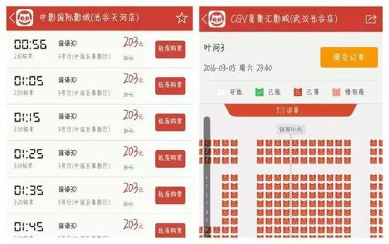 图为电影上映期间,武汉一家影院的午夜场,票价为203元的《叶问3》在购票平台显示为满座,这种看似不同寻常的现象是票房注水的一种常见手段。