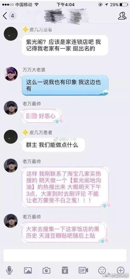 有微博曝光称,PG One的粉丝误以为紫光阁是个饭店,为了“黑”对方,疑似买了微博的热搜话题,便出现了“紫光阁地沟油”这个让人哭笑不得的东西。
