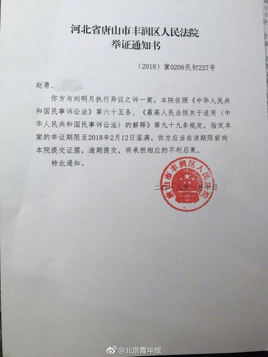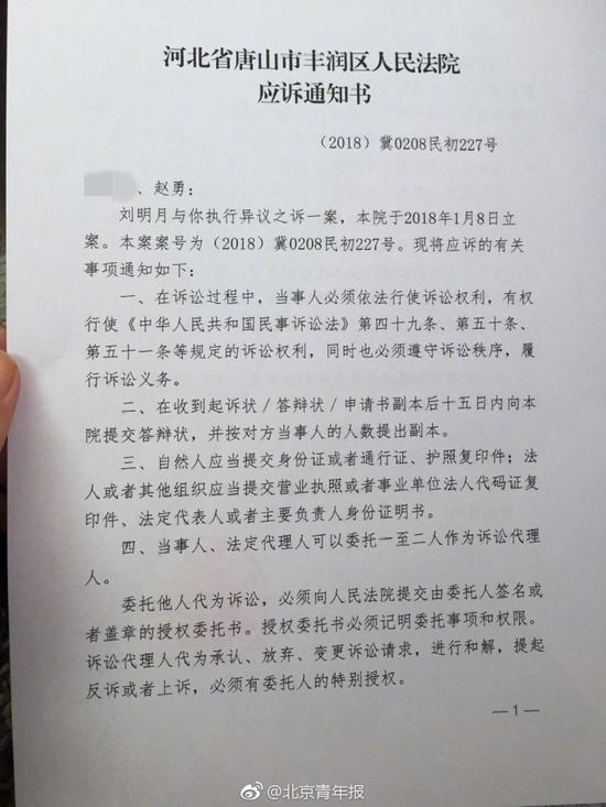 [唐山教科书式老赖事件进展:肇事司机女儿提起“执行异议之诉”]13日晚,受害者家属赵勇告诉北青报记者,近日肇事者黄淑芬女儿刘明月,提起执行异议之诉。“我觉得这事挺荒唐的,(她这么做)是想否认黄淑芬出钱买的房,想让房子解封。”赵勇称今天收到法院快递,拿到了民事起诉受理通知书。通知书显示:法院受理“刘明月诉你及第三人黄淑芬执行异议之诉一案”。诉状内容显示,其(刘明月)名下房产为刘个人出资,黄(黄淑芬)近两年收入和40万贷款用于保险市场投资及团队建设上,与交通事故纠纷一案无任何关联,否认转移财产。同时要求:1解封房产;2被告(也就是赵勇)承担诉讼费用。目前,唐山市丰润区法院已受理此案。(北青报记者 张雅 杨琳)