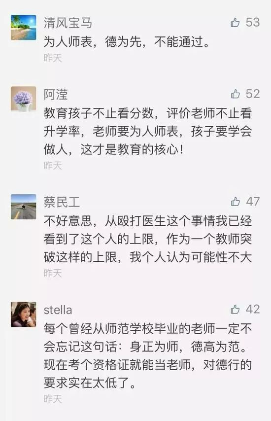 有人认为,教师只是一种职业身份,出了校门就是普通公民,“伤医”等行为与职业身份无关。但教师职业有其神圣的一面,承担着育人的特殊角色,承载着较高的道德期许,在岗位、职称、奖励等评审中,对其师德进行全面评估,是应该的。
