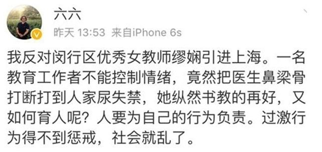 2015年9月,曾将医生打至骨折尿失禁,成为有名的“医闹”;2016年10月,想申报落户,却遭网友举报,最终“因个人原因,自愿撤销”落户申请;近日,高级教师资格评审公示,又被网民在名单中揪出,并对其师德提出非议……上海某中学女教师缪某近来又被推上风口浪尖。