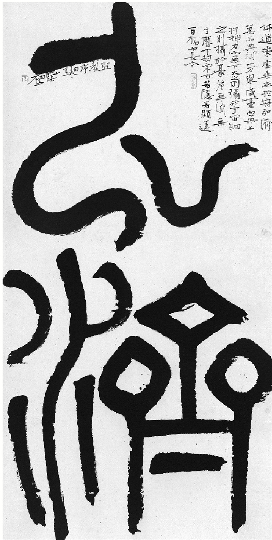 | 这件用金文书就,实际上靠近甲骨文,还有草书的意味。譬如说,“济”字的三点水拉长,“弘”和“济”,一在右一在左,布局反其道为之。 |