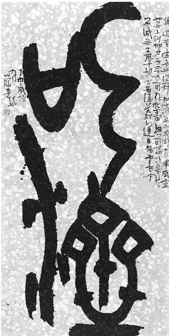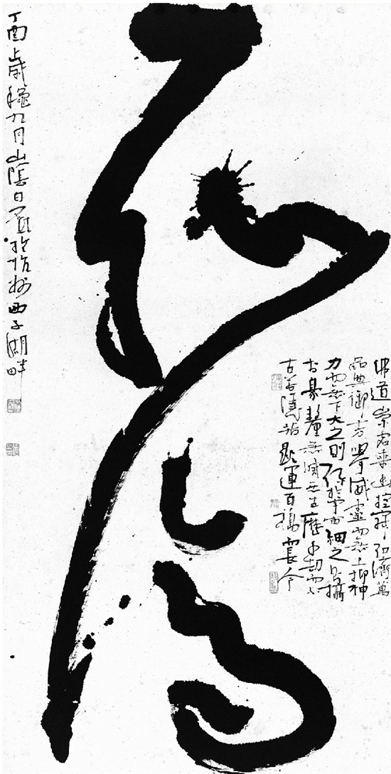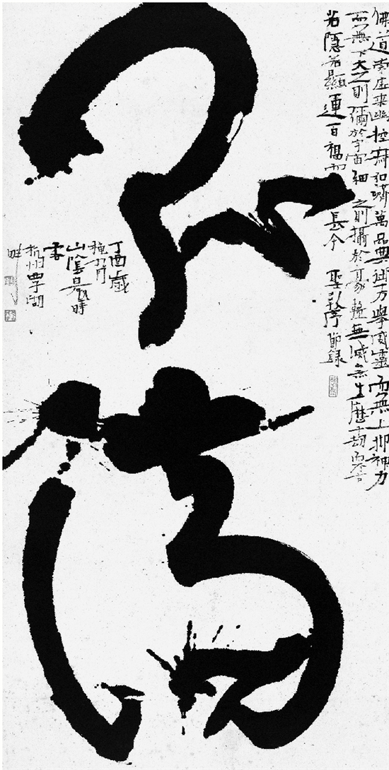 “汉字规范与书法创作之间的关系是微妙而复杂的。它们如同祖宗与后代,互为牵连,但不完全相同。子孙可以顺着前辈的路走,也可以另辟蹊径。譬如说,隶变是子孙对篆字前辈的突破,草书则又是对隶书的突破。所以,固守与突破,虽总是一对矛盾,但不是没有转化的可能。相反,从文字发展和艺术发展的角度看,没有突破便很可能走向死亡。应该说,我们的汉字是幸运的,因为我们的祖先们不断地开拓,以使汉字至今生生不息。”