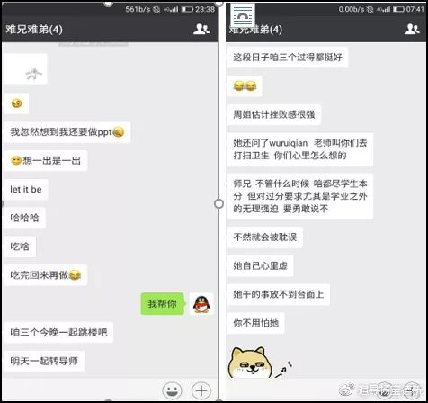 文章称,有师妹看不下去主动帮杨宝德分担工作,结果被周某训斥。从聊天记录也可看出,杨宝德师妹劝其不要理周某,并称周某“不断践踏学生的底线,所作所为发指”。