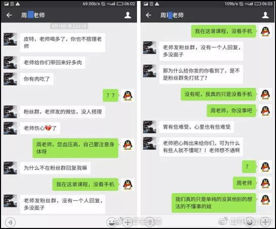 周某会在师门大群里发消息,如不回复就私聊质问:“老师把心掏出来给你们,可为什么有些人就不懂呢?”