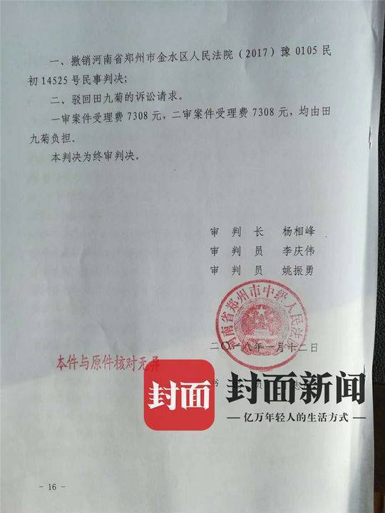 备受全国关注的“电梯劝烟猝死案”于1月23日在河南郑州市中级人民法院驻经开区综合审判庭二审公开宣判。封面新闻(thecover.cn)记者从劝阻吸烟者杨先生的代理律师单艳伟处了解到,据(2017)豫01民终14848号判决书,法院驳回了死者家属田女士的诉讼请求,一审中判决杨先生补偿田女士1.5万元的判决结果也被纠正,一审二审共计1.4万余元诉讼费由田女士承担。