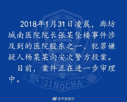 1月31日,安次警方官方微博“@平安安次”再次通报称,廊坊城南医院院长坠楼自杀一事中,另一名涉案医院股东杨某某目前已投案,案件正在进一步审理中。